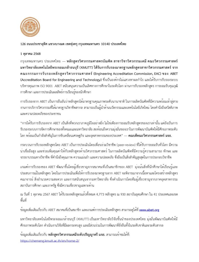 หลักสูตร วิศวกรรมเคมี มหาวิทยาลัยเทคโนโลยีพระจอมเกล้าธนบุรี (KMUTT) ได้รับการรับรองมาตรฐานระดับโลกจาก ABET เป็นที่เรียบร้อยแล้ว ![]()