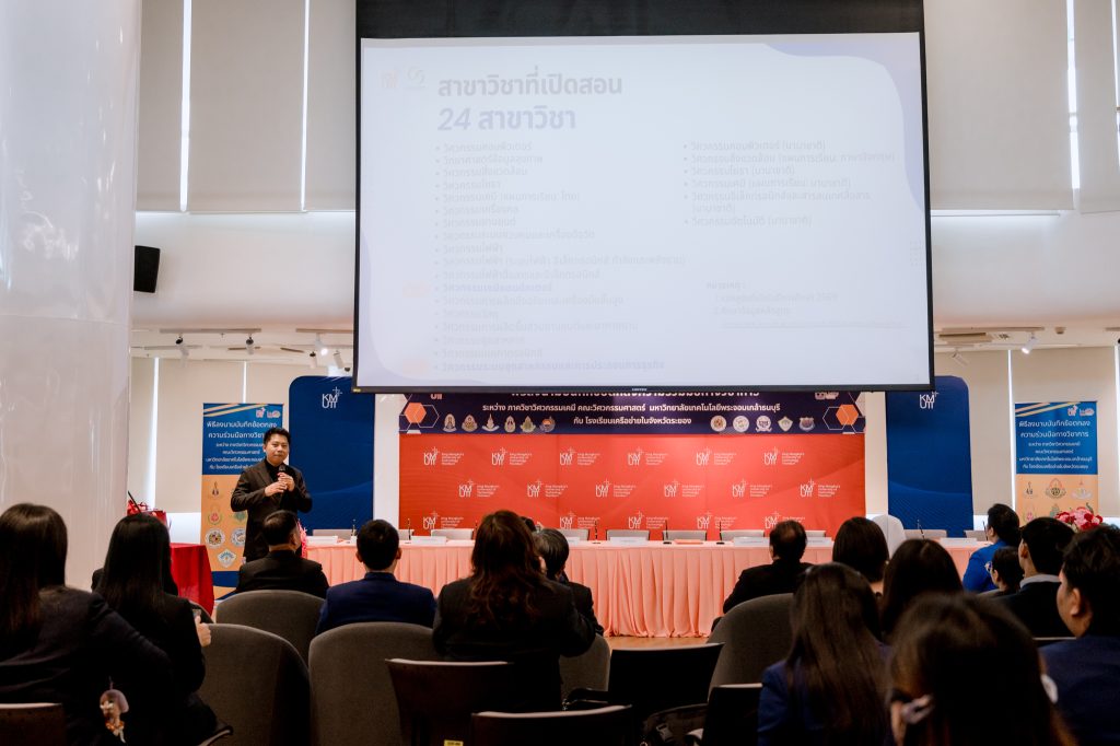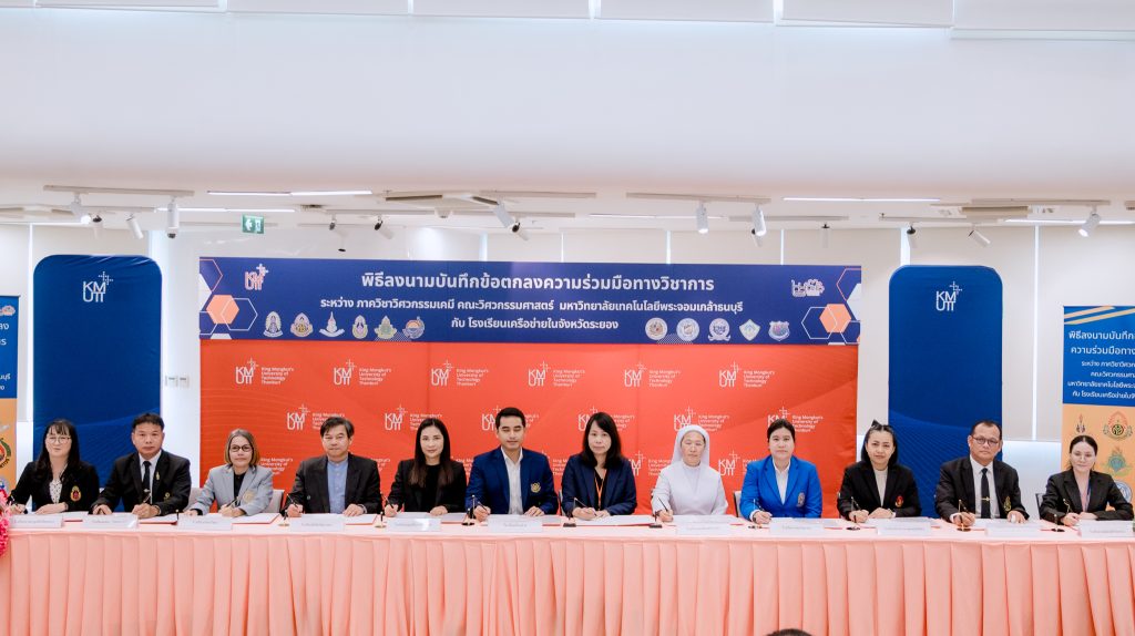 ในวันที่ 9 มีนาคม 2569 ภาควิชาวิศวกรรมเคมี คณะวิศวกรรมศาสตร์ มหาวิทยาลัยเทคโนโลยีพระจอมเกล้าธนบุรี (มจธ.) จัดพิธีลงนามบันทึกข้อตกลงความร่วมมือทางวิชาการกับโรงเรียนเครือข่ายในจังหวัดระยอง เพื่อส่งเสริมความร่วมมือด้านการศึกษา การพัฒนาศักยภาพนักเรียน และการสร้างแรงบันดาลใจในการศึกษาต่อด้านวิศวกรรมศาสตร์ โดยเฉพาะสาขาวิศวกรรมเคมี รวมทั้งการจัดกิจกรรมทางวิชาการ การแนะแนวการศึกษาต่อ และการพัฒนาทักษะด้านวิทยาศาสตร์และวิศวกรรมให้กับนักเรียนในเครือข่าย